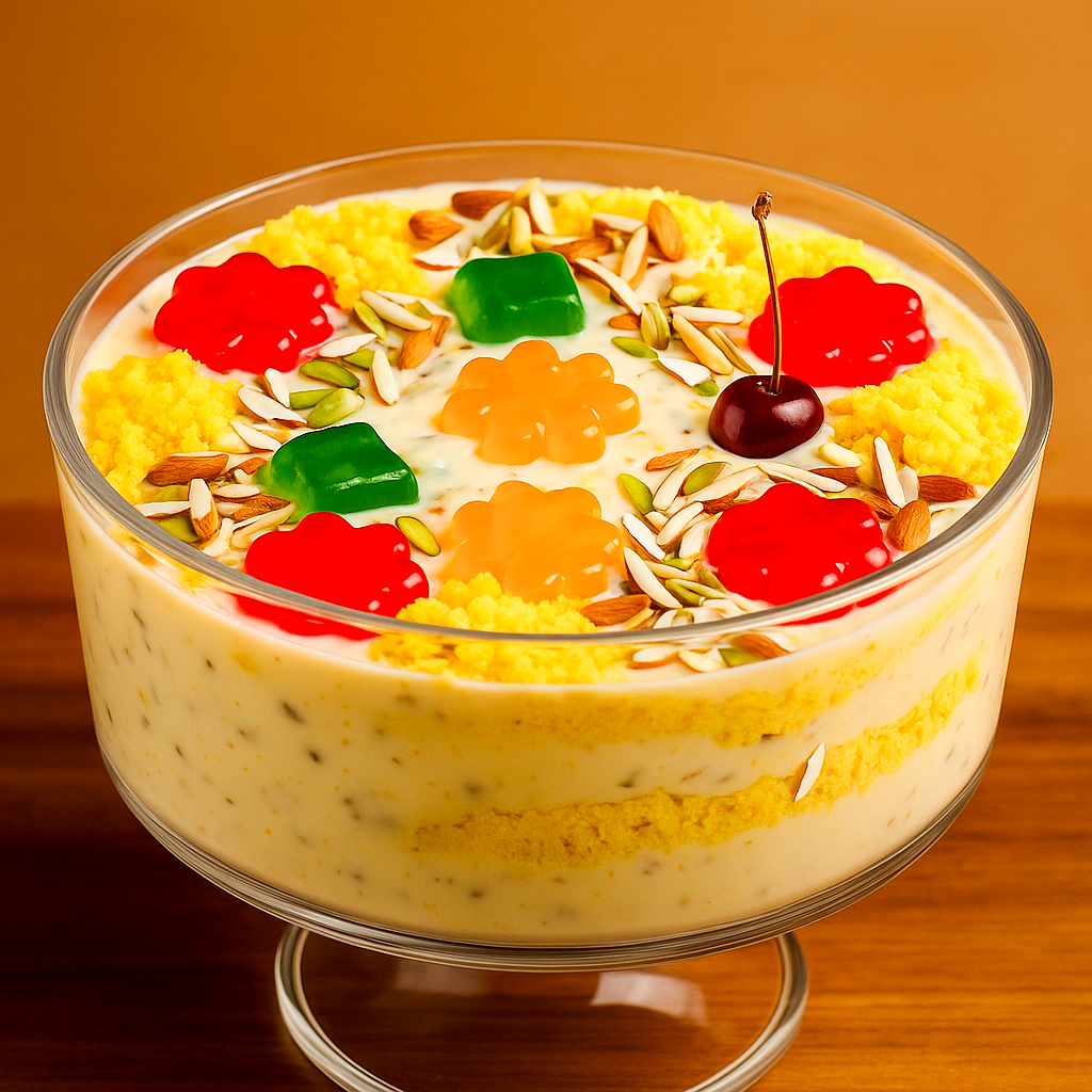 Our Trifle Custard is made with homemade goodness, layered with cream, fresh fruits, jelly, cocktail mix, and soft cake pieces. Rich, creamy, and delicious—perfect for every dawat at your home. We prepare this organic dessert with love and care in our kitchen.